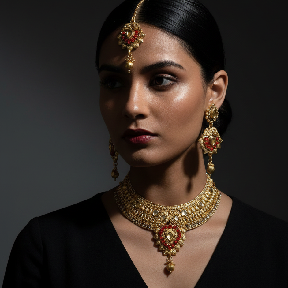 This JewelMaze Designer Austrian Stone Choker Necklace Set represents the pinnacle of bridal jewelry craftsmanship. Hand-selected Austrian stones showcase unparalleled optical clarity and prismatic brilliance, essential for wedding photography and formal occasions. The choker design sits elegantly at the collarbone, creating a refined silhouette that complements traditional and contemporary bridal wear alike.