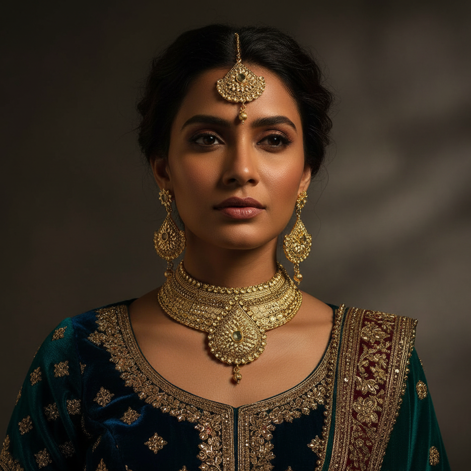 This JewelMaze Designer Austrian Stone Choker Necklace Set represents the pinnacle of bridal jewelry craftsmanship. Hand-selected Austrian stones showcase unparalleled optical clarity and prismatic brilliance, essential for wedding photography and formal occasions. The choker design sits elegantly at the collarbone, creating a refined silhouette that complements traditional and contemporary bridal wear alike.