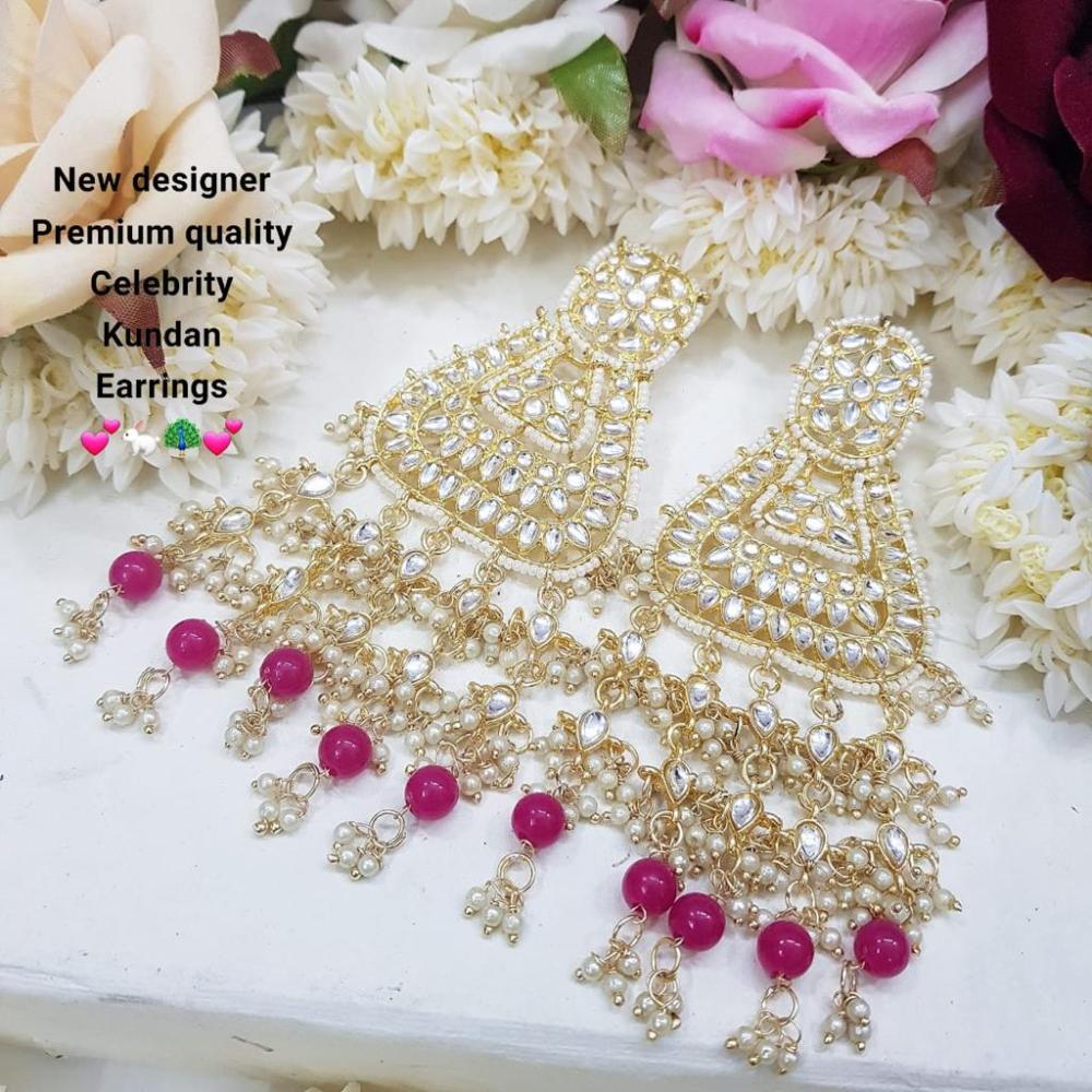 JewelMaze Gold Plated Pink Beads & Kundan Dangler Earrings