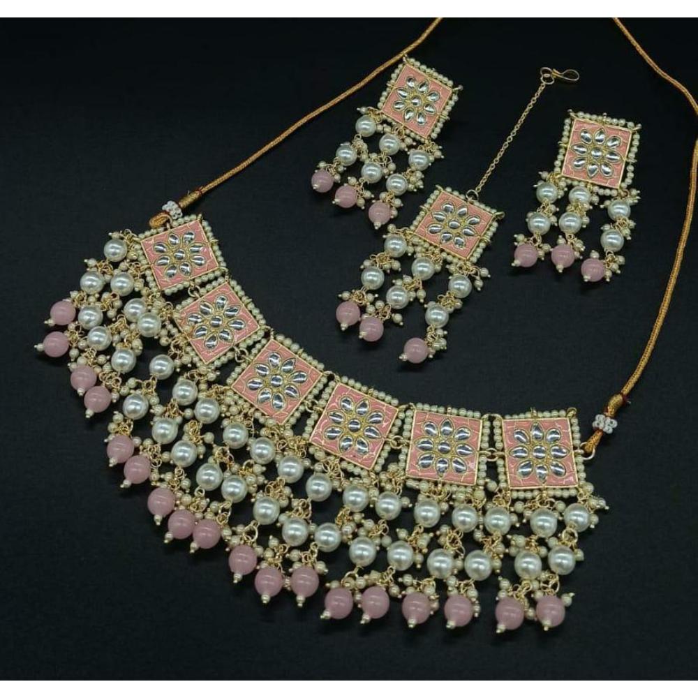 JewelMaze Light Pink Meenakari & Kundan Necklace Set With Maang Tikka