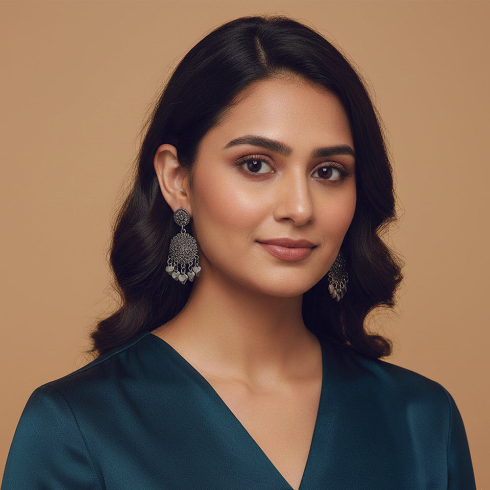 Jewelmaze Oxidised Finish Dangler Earrings showcase timeless elegance through their distinctive darkened metallic patina. The oxidised finish creates a sophisticated, vintage-inspired aesthetic that complements both traditional and contemporary styling. These dangler earrings feature graceful movement, adding dimension and visual interest to any ensemble. The oxidised treatment enhances depth and character, making each piece appear uniquely refined. Perfect for those seeking understated luxury with an artisanal touch, these earrings transition seamlessly from everyday wear to special occasions. The durable oxidised coating ensures lasting beauty while maintaining the piece's distinctive charm and appeal.