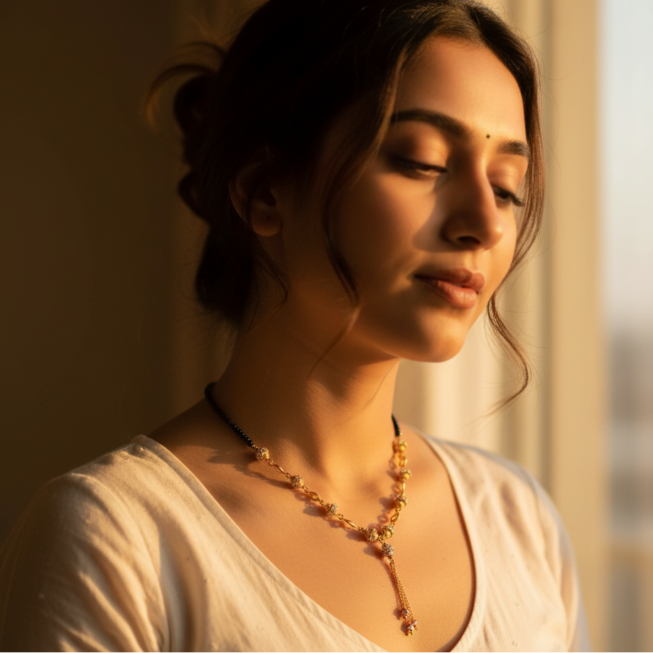 Discover refined sophistication with this Traditional Austrian Stone Bracelet Mangalsutra by JewelMaze. Featuring premium Austrian crystals set in an elegant bracelet format, this piece redefines the classic mangalsutra with contemporary versatility. The brilliantly faceted stones sparkle with exceptional clarity, adding understated luxury to your wrist. Designed for the modern woman who values heritage and style, it transitions seamlessly from everyday elegance to festive occasions.